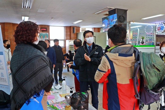 [로컬세계 박상진 기자]류태호 태백시장이 휴일인 8일 오전 다중이용시설인 태백역과 시외버스터미널을 방문, 신종 코로나바이러스 관련 대응 상황을 점검하고 관계자들을 격려했다.