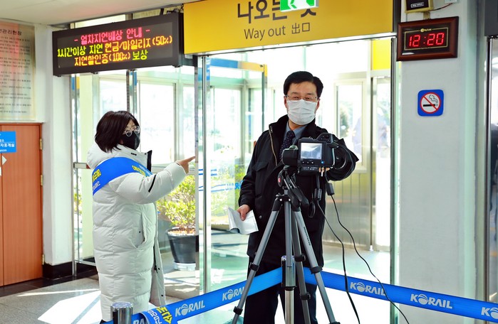 ▲류태호 태백시장이 태백역에 설치된 열 감지 카메라를 직접 테스트해 보고 있다.(태백시 제공) |