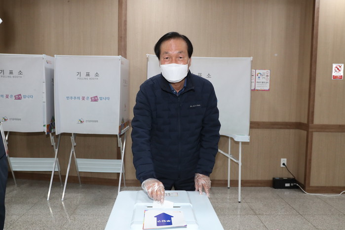 [로컬세계 박상진 기자]김주수 의성군수가 10일 오후 2시, 금성면문화센터 1층에 위치한 사전투표소를 찾아 한 표를 행사했다.