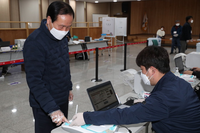 김 군수는 투표소 입구에서 손소독 후 발열 체크를 하고 위생장갑을 낀 뒤 투표용지를 받는 등 선거관리위원회에서 발표한 행동수칙을 지키며 투표에 임했다.
