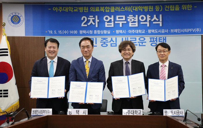 [로컬세계 고용주 기자]경기 평택시는 15일 시청 종합상황실에서 아주대학교, 평택도시공사, 브레인시티PFV(주)와 평택 브레인시티에 아주대병원을 포함한 의료복합클러스터 건립을 위한 2차 업무협약을 체결했다고 밝혔다.