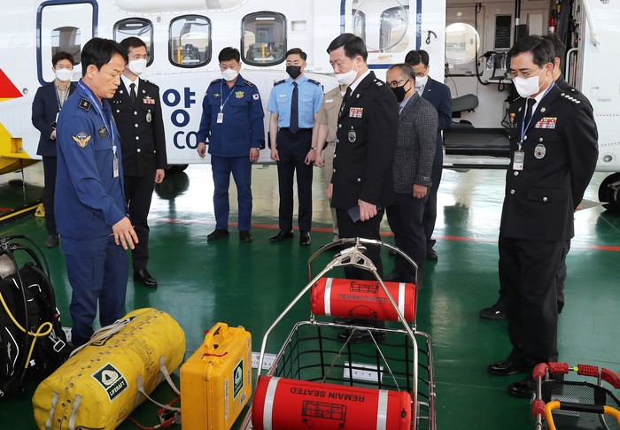 | ▲구자영 남해해경청장이 부산항공대장(경감 차주호)으로 부터 구조장비에 대한 설명을 듣고 있다. |