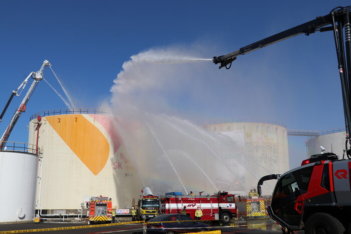 이날 훈련은 대규모 지진으로 인해 영도구 SK에너지 부산물류센터의 위험물 저장탱크의 파괴로 대형화재 및 인명피해가 발생한 상황을 가정해 진행됐다.