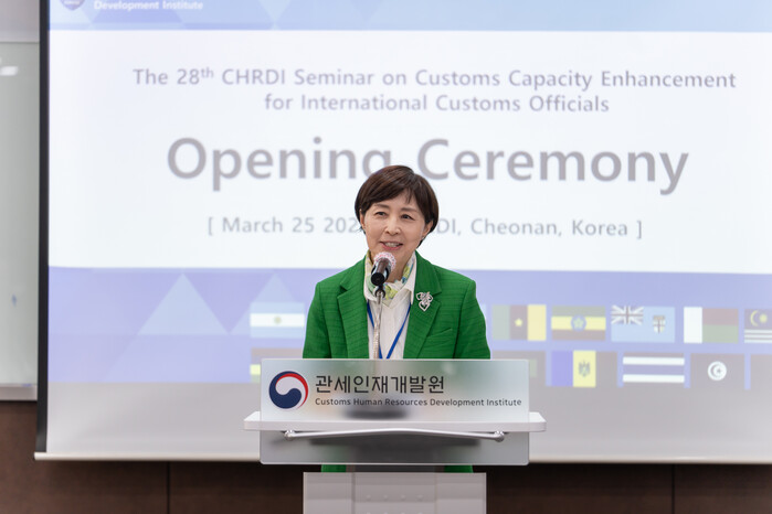 ▲유선희 관세인재개발원장이 25일 관세인재개발원에서 개최한 '제28차 관세행정 능력배양 연수회'에서 인사말을 하고 있다. 관세청 제공 |
