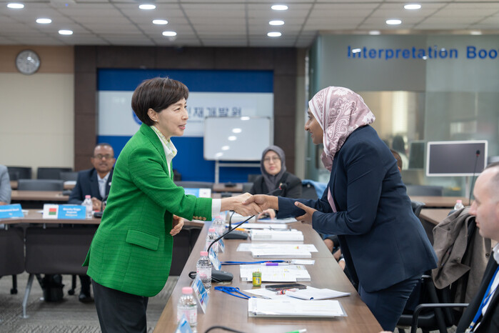 ▲유선희 관세인재개발원장(왼쪽)이 25일 관세인재개발원에서 개최한 '제28차 관세행정 능력배양 연수회' 참가자와 인사를 나누고 있다. |