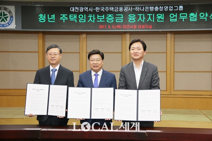 대전시는 8일 시청 대회의실에서 권선택 시장과 김재천 한국주택금융공사 사장, 민인홍 하나은행 충청영업그룹 대표가 참석한 가운데 ‘청년주택임차보증금 융자지원 업무협약’을 체결했다.