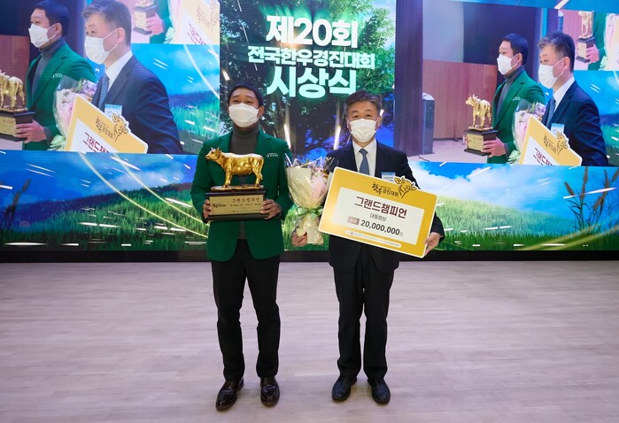 | ▲ 농식품부가 주최하고 농협 경제지주가 주관하는 제20회 전국한우경진대회에서 전남 완도군 박지훈 농업인(왼쪽)이 그랜드 챔피언으로 선정되어 박범수 농식품부 차관보로부터 대통령상을 전달받고 기념촬영을 하고 있다. 농협 제공 |