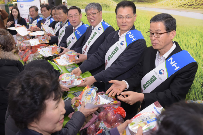 ▲서울 서초구 농협 하나로마트 양재점에서 열린‘접경 지역 농특산물 소비촉진 행사’에서 조재호 농림축산식품부 차관보(오른쪽에서 두번째), 우성태 농협경제지주 판매유통본부장(오른쪽에서 세번째), 나병만 농협유통 대표이사(오른쪽에서 첫번째), 접경 지역 관내 조합장 등이 접경 지역 농·특산물을 홍보하고 있다. |