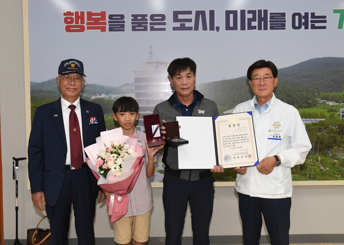 ▲ 부산 기장군(정종복 군수 오른쪽 첫번째, 조택상 오른쪽 두번째,)은 27일 故 조용길님의 자녀 조택상씨에게 화랑무공훈장과 훈장증을 전수했다. 기장군 제공 |