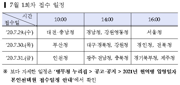 또한 코로나19로 인한 대입수학능력시험일 연기 등 정부정책을 반영해 병역판정검사를 늦게 받은 현역병 입영대상자에게도 골고루 입영신청 기회가 주어지도록 입영신청은 연중 3회로 나누어 접수한다. 이번이 1회차 접수로 2회차는 9월, 3회차는 수학능력시험일 이후인 12월에 접수할 예정이다.