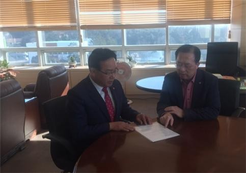 | ▲이권재 예비후보(왼쪽)가 홍승표 사장에게 경기남부권 통합관광벨트 오산 포함을 요청하고 있다. |