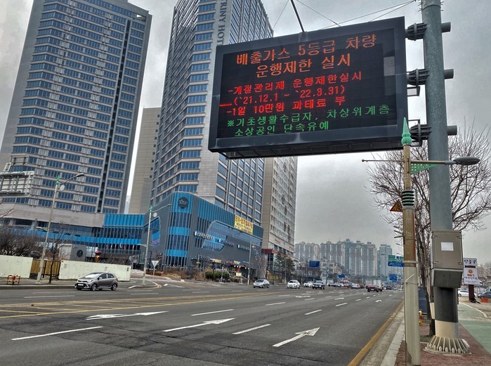 | ▲미세먼지 저감 대책에 따라 배출가스 5등급 차량 운행제한을 알리고 있는 전광판 모습. |