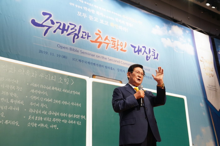 ▲지난 19일 제주도 서귀포시 국제컨벤션센터에서 열린 신천지 주 재림과 추수화긴 대집회에서 이만희 총회장이 강의를 펼치고 있다.(신천지예수교회 총회 홍보실 제공) |