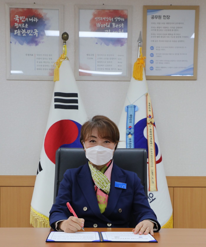 ▲조은정 관세국경관리연수원장이 4일 비대면으로 열린 철도특별사법경찰대와 정부 특수견의 효율적 양성을 위한 업무협약서에 서명하고 있다./관세청 제공 |