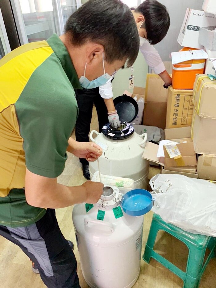 ▲ 농협 한우 유전자원 은행 시범사업을 위해 장성축협 직원들이 정액 분배작업을 하고 있다. 농협 제공 |