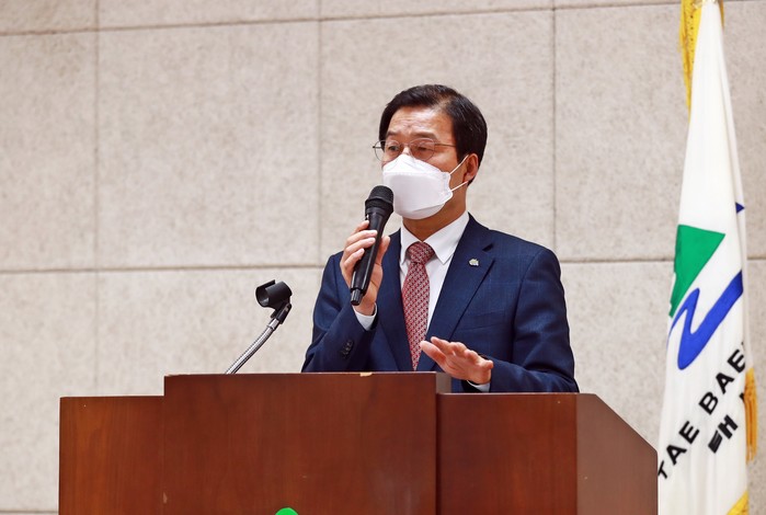▲류태회 태백시장이 15일 열린 '2020년 태백시 자원봉사자대회'에서 인사말을 하고 있다.(태백시 제공) |