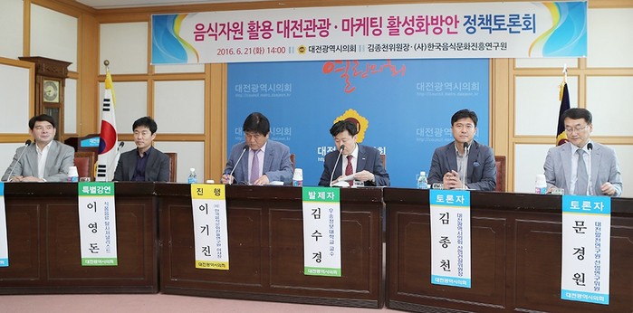 [로컬세계 조윤찬 기자]김종천 대전시의원(더민주‧서구5)과 (사)한국음식문화진흥연구원은 공동으로 21일 대전시의회 대회의실에서 ‘음식자원을 활용한 대전의 도시 관광·마케팅 활성화 방안 정책토론회’를 개최했다.