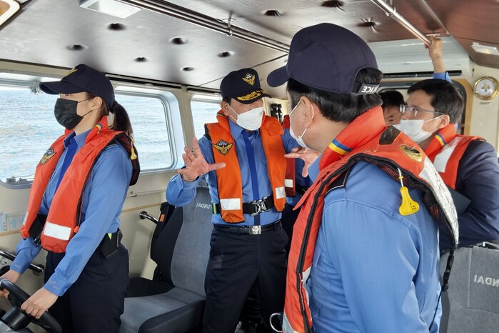 ▲ 윤병두 남해해양경찰청장이 연안구조정 현장 지도점검을 하고 있다 남해해경청 제공 |