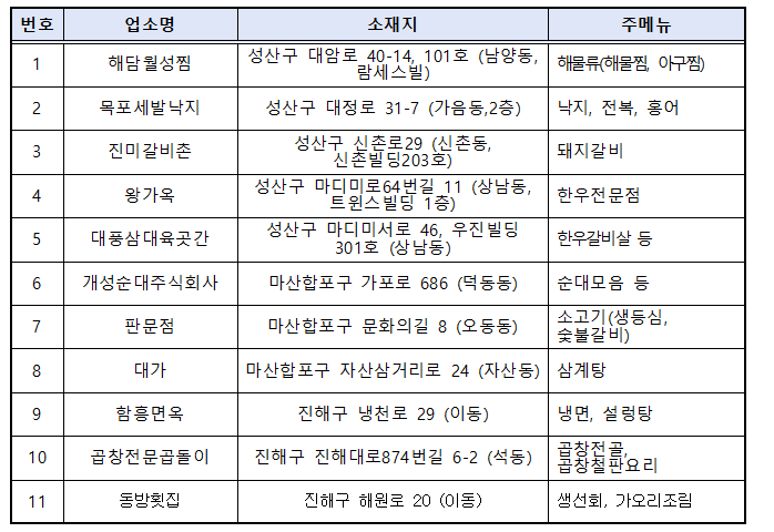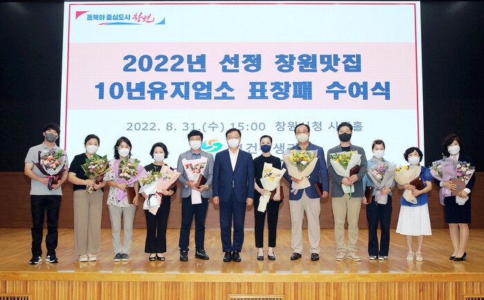 시는 2021년 17명의 창원맛집 10년 유지업소 영업주에게 표창패 및 현판을 수여한 바 있으며, 올해는 창원맛집 선정 10년차가 되는 업소 15개소에 대해 평가를 실시해 11개소를 창원맛집 10년 유지업소로 선정했다.