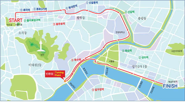 이번 대회 참가 부문은 10km코스와, 하프코스로 나뉘어 신청할 수 있다. 10월 가을 도심의 정취를 만끽할 수 있는 10km코스는 서울광장을 출발해 종로~을지로~청계천을 거쳐 서울광장으로 골인하고, 하프코스는 종로~청계천~살곶이공원~뚝섬 한강시민공원으로 도착하는 코스다.