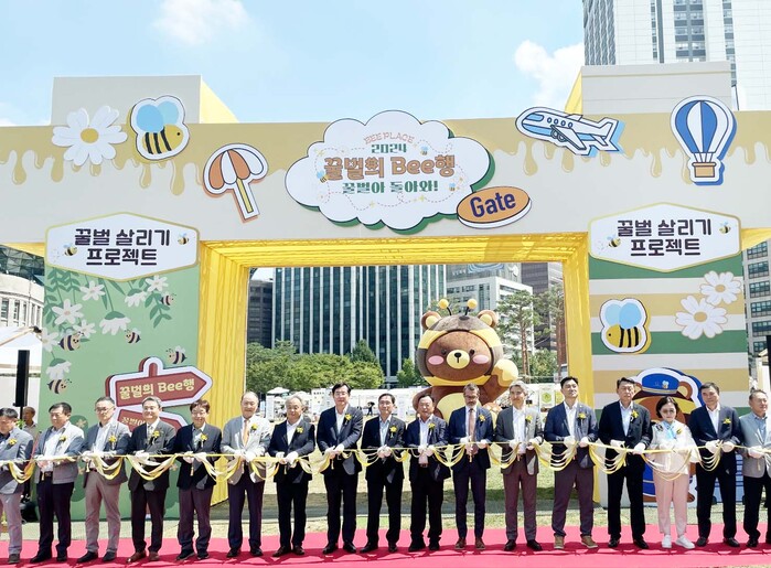 ▲19일 서울광장에서 꿀벌살리기 운동 프로젝트 개막식을 진행하며 주요 참석자들이 테이프컷팅식을 하고 있다.(왼쪽 7번째부터) 박근호 (사)한국양봉협회장, 안병우 농협경제지주 축산경제대표이사, 하욱원 축산물품질평가원 부원장, 김용래 한국양봉농협 조합장, 예르네이 뮐러 슬로베니아 주한대사관 대사, 김인제 서울특별시의회 부의장, 정준호 서울특별시의회 시의원, 김상수 농협중앙회 서울본부장. 농협 제공 |