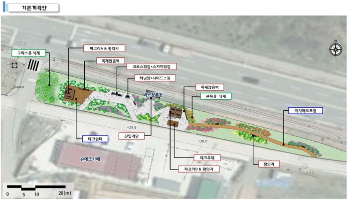 해당부지는 마산동 구래리 마을 입구에 위치하고 있으며 부지 내 보행자들이 쉴 수 있는 파고라 벤치 등이 설치될 예정으로 관목 및 교목을 심어 아름다운 녹지대를 조성할 계획이다.