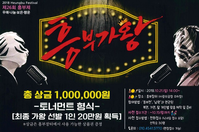 선발된 가왕 1인에게는 20만원 상당의 흥부제 상품권이 수여되며 참가자들에는 총 상금 100만원이 주어져 그야말로 ‘흥’나고 ‘박’터지는 시간이 기대된다.