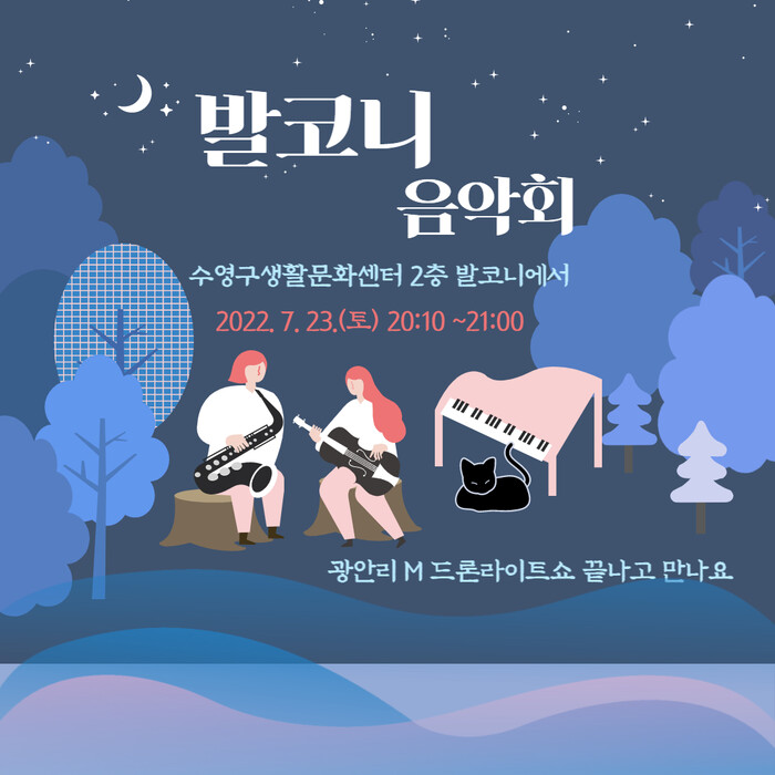 [로컬세계 부산=맹화찬 기자]부산시 수영구는 오는 23일 오후 8시 10분부터 광안리 수영구 생활문화센터 2층에서 '발코니음악회'를 개최한다고 밝혔다.