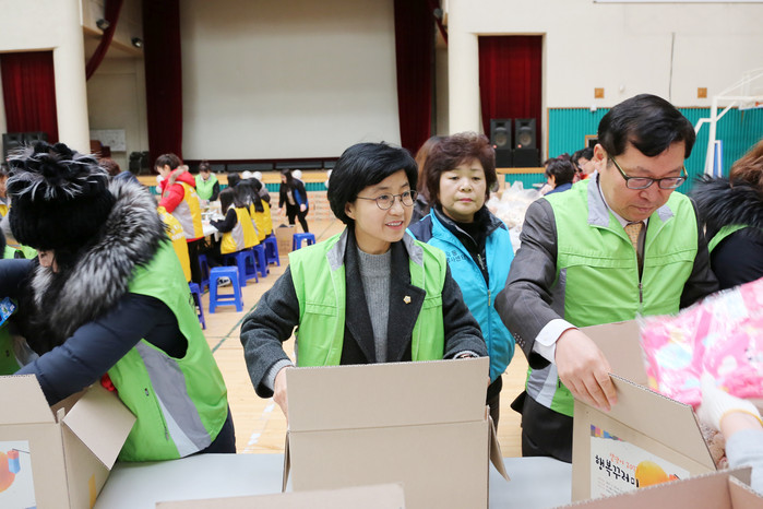 이날 만들어진 설맞이 행복꾸러미는 지역경제 활성화 및 전통시장 살리기를 위해 관내 전통시장에서 구입한 생활필수품과 먹거리로 구성됐다.