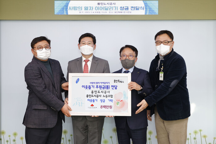 이날 용인도시공사 최찬용 사장과 양희정 용인도시공사 노조위원장 등 관계자 3명이 이상일 시장실을 방문해 성금을 전달했다.