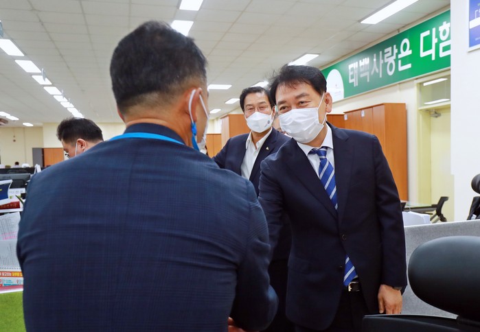 이날 이광재 국회의원은 류태호 시장을 만나 시청 민원실을 순회하며 직원들을 격려한 뒤, 집무실에서 태백 지역 시정 주요현안에 대한 의견을 듣고 국비 확보 등 해결방안을 함께 모색했다.
