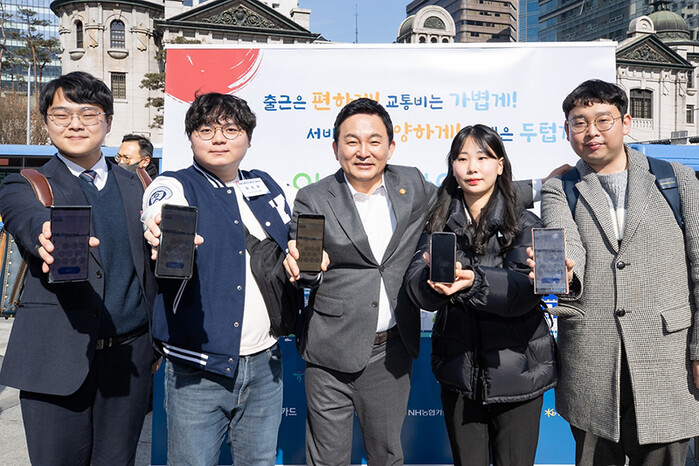 ▲ 22일 서울 명동에서 원희룡 국토부 장관과 청년들이 알뜰교통카드 모바일 앱을 선보이고 있다.(사진=국토교통부) |