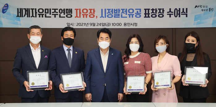 | ▲백군기 용인시장(왼쪽)이 24일 자유민주주의 수호는 물론 시민 안전과 지역사회 발전에 헌신한 공로로 세계자유민주연맹이 수여하는 ‘자유장’을 수상하고 관계자와 기념촬영을 하고 있다. 용인시 제공 |
