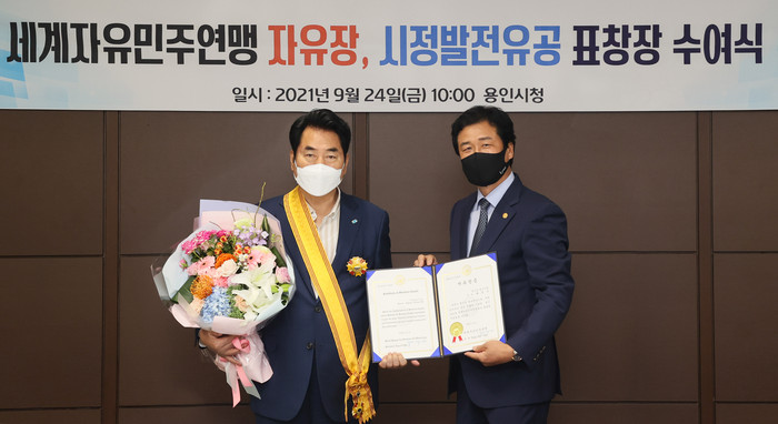 [로컬세계 김병민 기자]경기 용인시는 백군기 시장이 24일 자유민주주의 수호는 물론 시민 안전과 지역사회 발전에 헌신한 공로로 세계자유민주연맹으로부터 ‘자유장’을 수상했다고 밝혔다.