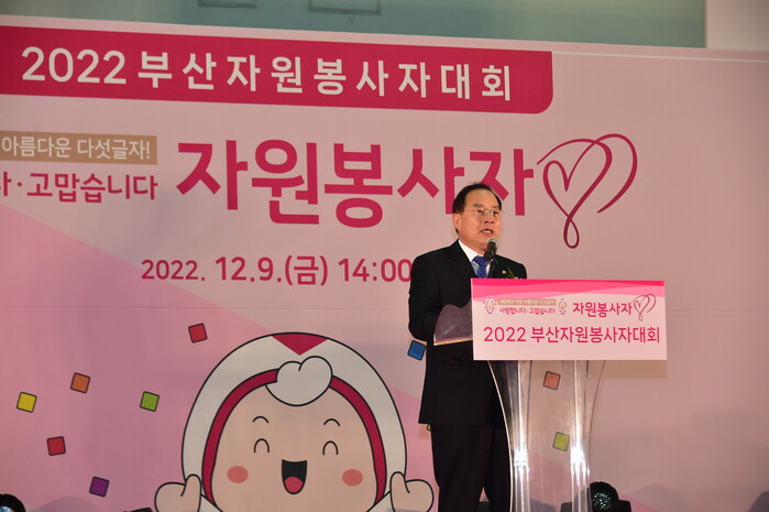 [로컬세계 부산=맹화찬 기자]하윤수 부산시교육감이 9일 오후 해운대구 벡스코 제2전시장 4C홀에서 박형준 부산시장, 안성민 부산시의회 의장, 부산시 자원봉사센터 관계자 등 1000여명이 참석한 가운데 열린 ‘2022 부산자원봉사자대회’에서 인사말을 하고 있다.