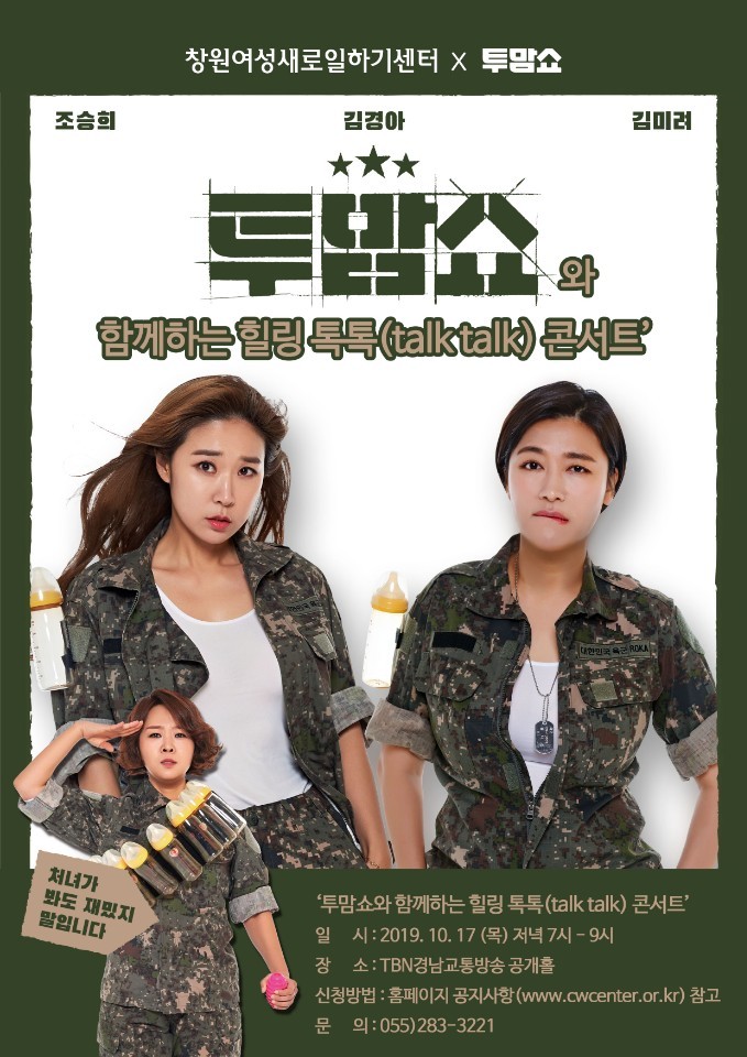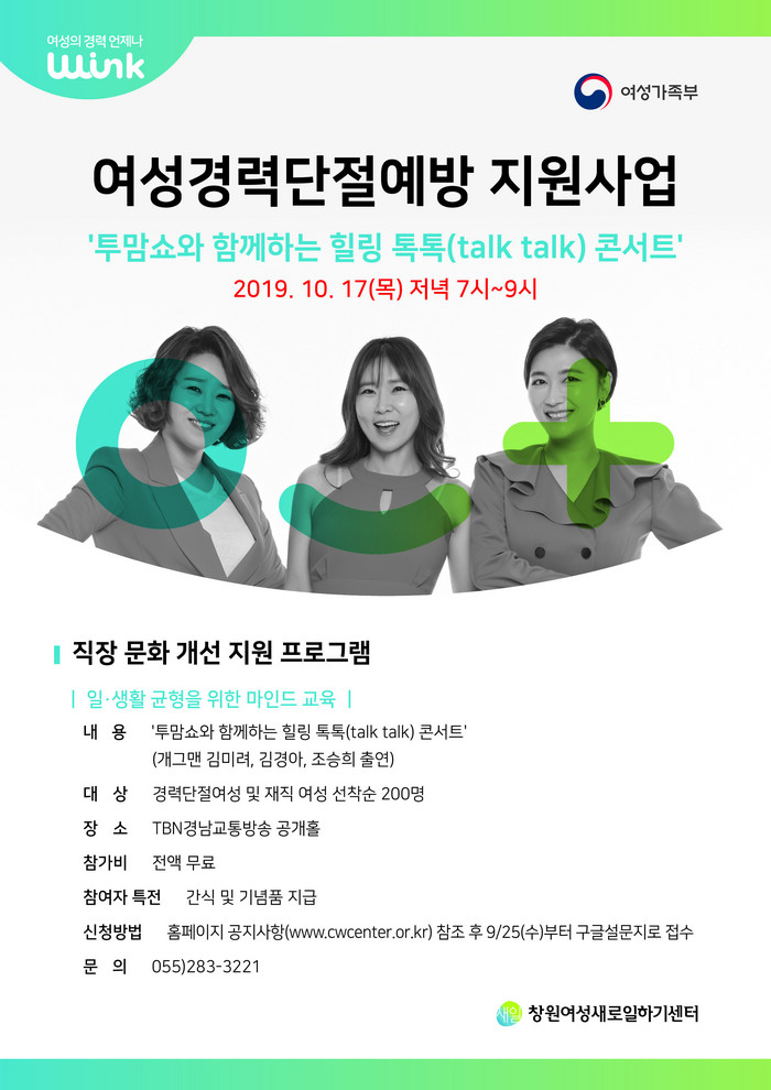 워킹맘, 육아맘의 희로애락을 소재로 한 ‘힐링 톡톡 콘서트’는 개그우먼 김미려, 김경아, 조승희가 출연하여 실제 육아 경험을 바탕으로 경력단절 예방과 관련된 ‘관객과 함께하는 토크쇼’, ‘폭풍공감 콩트’, ‘관객참여 퀴즈쇼’ 등 다채로운 구성으로 재미와 감동을 더할 예정이다.
