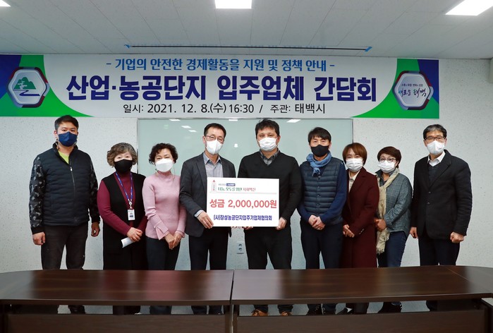 [로컬세계 박상진 기자]강원 태백시는 지난 8일 사단법인 장성농공단지 입주기업체 협의회(회장 최이호)가 장성농공단지·동점산업단지 입주업체 간담회 행사시 장성지역 취약계층 지원을 위한 2022 희망나눔 성금 200만원을 전달했다고 9일 밝혔다.