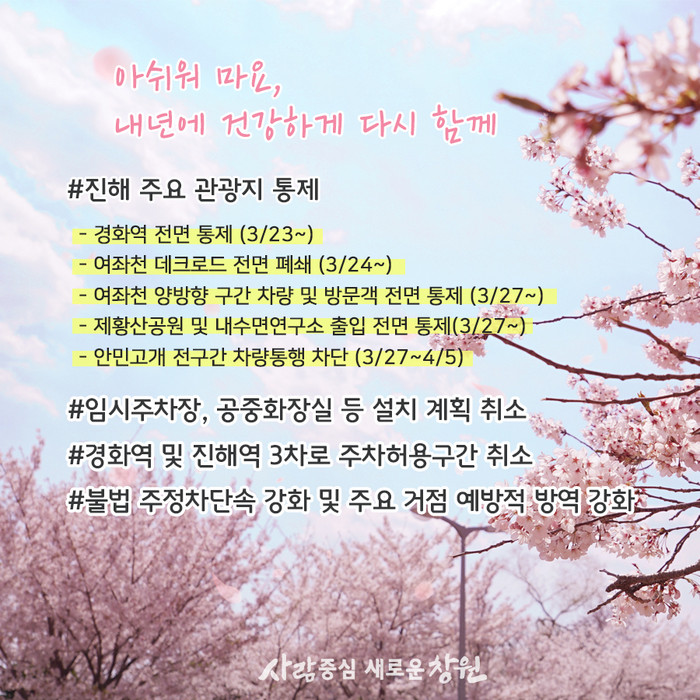 먼저 세계적인 벚꽃 명소인 진해 경화역은 23일부터 전면 통제한다. 물론 경화역으로 통하는 출입구 11곳 전체도 폐쇄조치하고 방문객 출입도 완전히 차단한다.