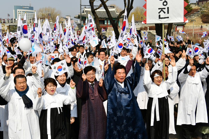 [로컬세계 고용주 기자]경기 수원시가 올해 3·1운동 100주년을 맞아 수원 방화수류정과 수원역 등 곳곳에서 시민 4000여 명이 모여 “대한독립만세!”를 외치며 행궁까지 행진했다.
