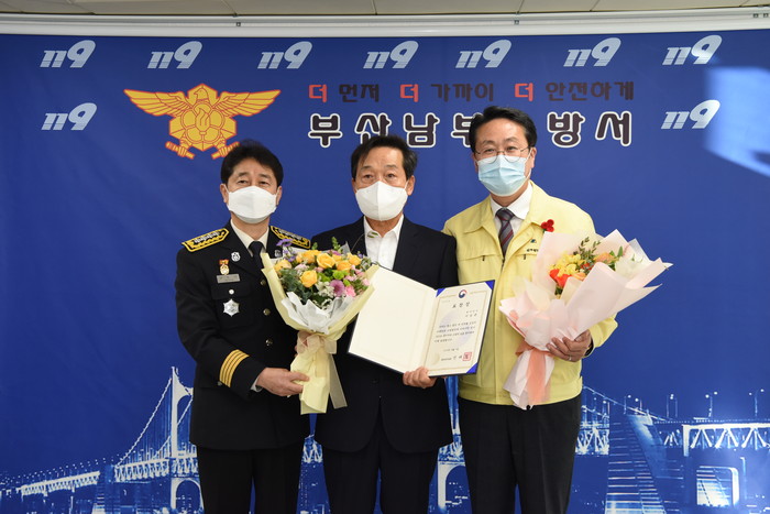▲59주년 소방의 날 이승준 부산 남구 장학회장은 행정안전부 장관 표창을 수상. 왼쪽부터 정영덕 남부소방서장, 이승준 남구장학회장, 박재범 남구청장. |