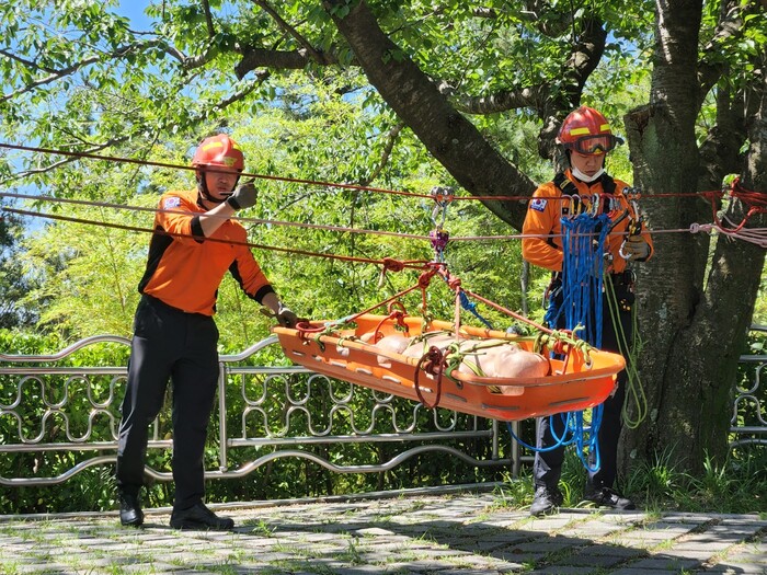 ▲고립된 구조대상자 수평 구조 훈련 모습. 남부소방서 제공 |