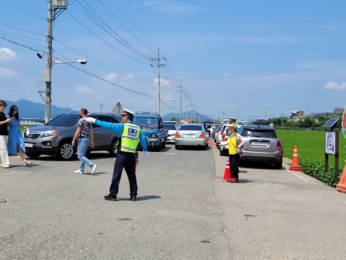 이들은 폭염이 기승을 부리던 지난 6~7일에도 동부마을로 가는 차량을 대상으로 한쪽으로만 운행하는 일방통행을 유도하고, 마을 안으로 차량이 진입하지 않고 마을 주변에 주차할 수 있도록 안내했다.