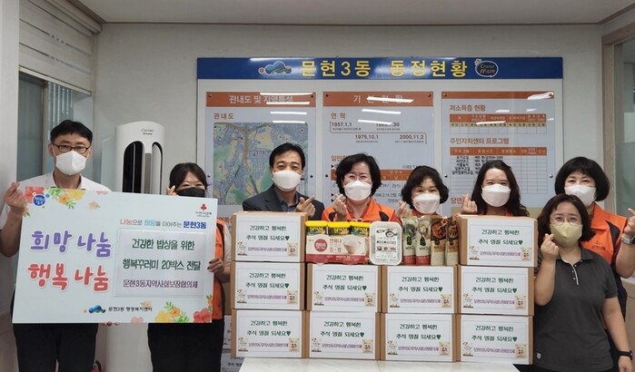[로컬세계 부산=맹화찬 기자]부산 남구 문현3동(동장 최재식)은 지난 31일 '건강한 밥상을 위한 행복꾸러미 20세트(100만원 상당)' 전달식을 개최했다고 1일 밝혔다.