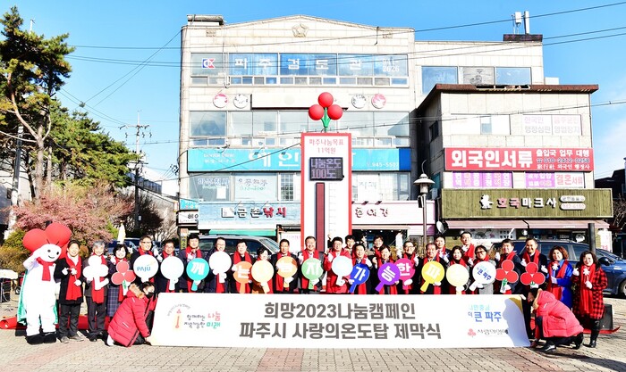 시는 사랑의 온도를 높여 지역사회 어려운 이웃에게 온기가 퍼질 수 있도록 8일 ‘희망 2023 나눔캠페인’ 사랑의 온도탑 제막식을 진행했으며, 김경일 파주시장, 이성철 파주시의장, 권인욱 경기북부사랑의열매 부회장, 파주시 고액기부자 등이 참석했다.