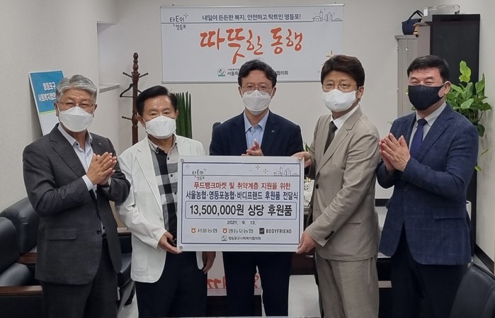 이정택 영등포농협조합장은 “영등포농협도 평소 지역사회를 위해 다양한 사업을 펼치고 있는데 금차 서울지역본부와 ㈜바디프랜드와 함께 나눔활동에 동참하게 돼 기쁘다. 지역주민들이 이웃의 정을 느끼며 코로나 상황을 이겨내셨으면 좋겠다”고 말했다.