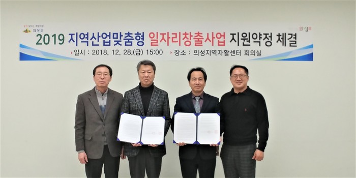 [로컬세계 박상진 기자]경북 의성군은 지난해 12월 28일 의성지역자활센터에서 올해 지역산업맞춤형 일자리창출 지원사업 업무협약 및 사업추진을 위해 안동고용노동지청과 지원약정을 체결했다고 2일 밝혔다.