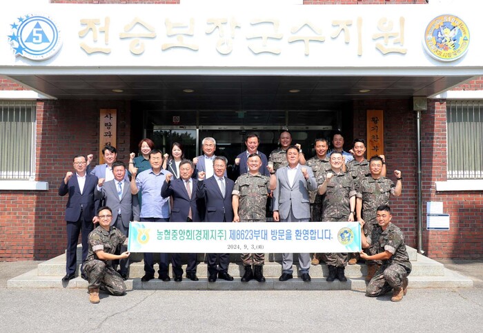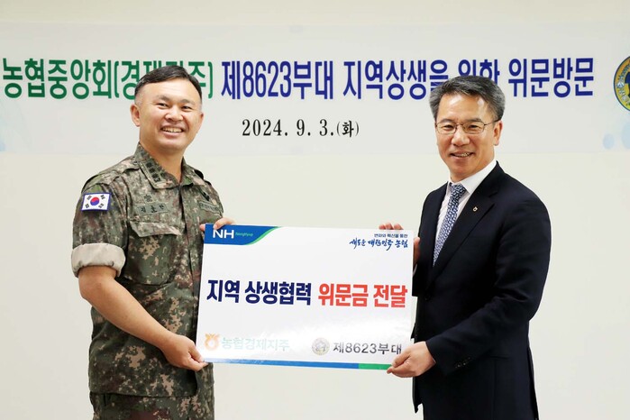 농협경제지주(농업경제대표이사 박서홍)가 3일 제8623부대(부대장 김용만)을 방문하여 군 장병 노고 격려 및 사기 진작을 위한 위문행사를 실시했다.