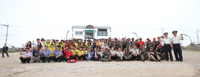 | ▲9일 화성시 제부리 백사장에서 민관 합동구조대원들이 화이팅 포즈를 취하고 있다. |