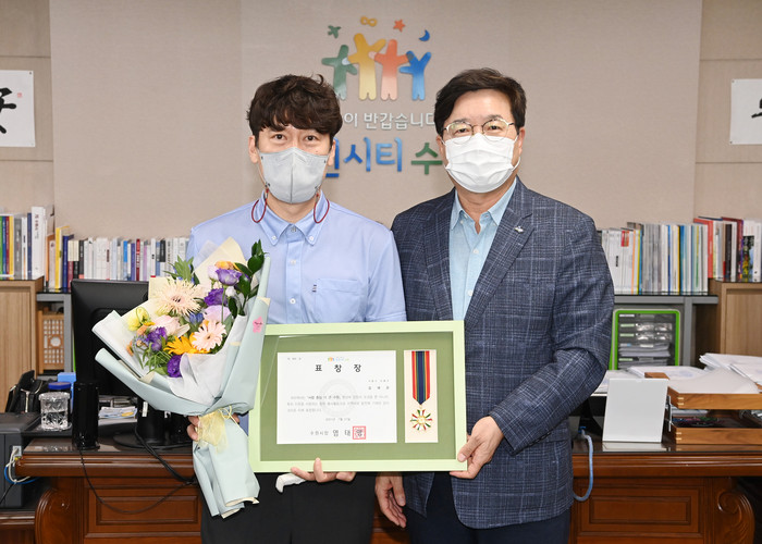 [로컬세계 고용주 기자]염태영 수원시장은 21일 집무실에서 김재관(45, 서울시 도봉구)씨에게 선행시민 표창을 수여했다.