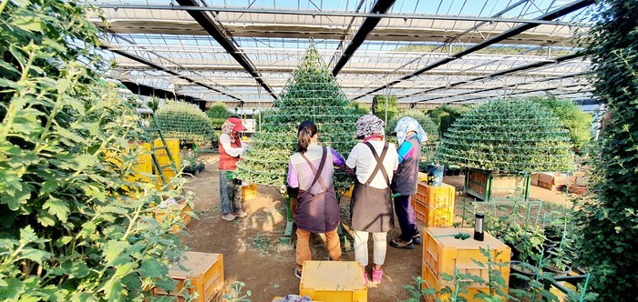 사방천지 가득한 국화를 보다보면 궁금증이 생긴다. 이 많은 국화는 어디서 오는 것일까? 축제기간은 보름 남짓이지만, 이 한 때의 아름다움을 위해 1년 내내 수십 명이 땀 흘리는 곳이 있다. 바로 마산합포구 현동 묘촌리의 창원농업기술센터 양묘장이다. 국화축제에 사용되는 꽃은 농가와 계약재배를 하기도 하지만, 대형 국화작품들은 상당수가 이곳에서 만들어진다. 국화축제를 앞둔 요즘 양묘장에서는 막바지 국화작품 손질과 작품 운반이 한창이다. 보통 동절기에는 내년 축제를 위해 꽃을 심어 가꾸고, 하절기에는 가을에 있을 축제 준비에 집중한다.